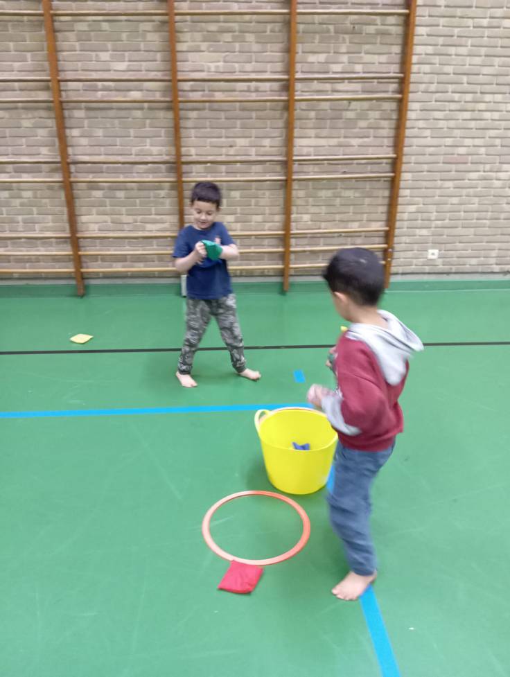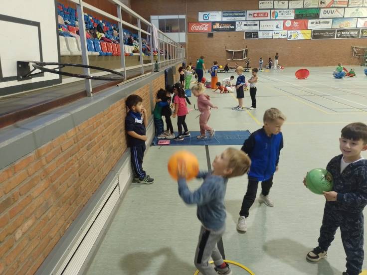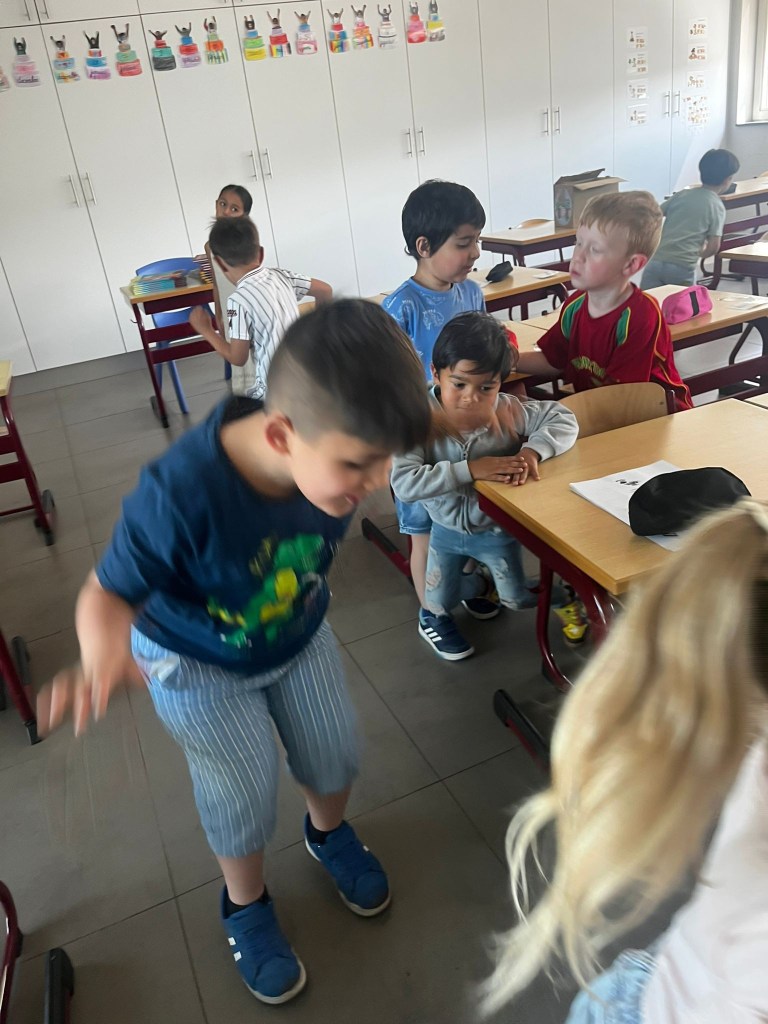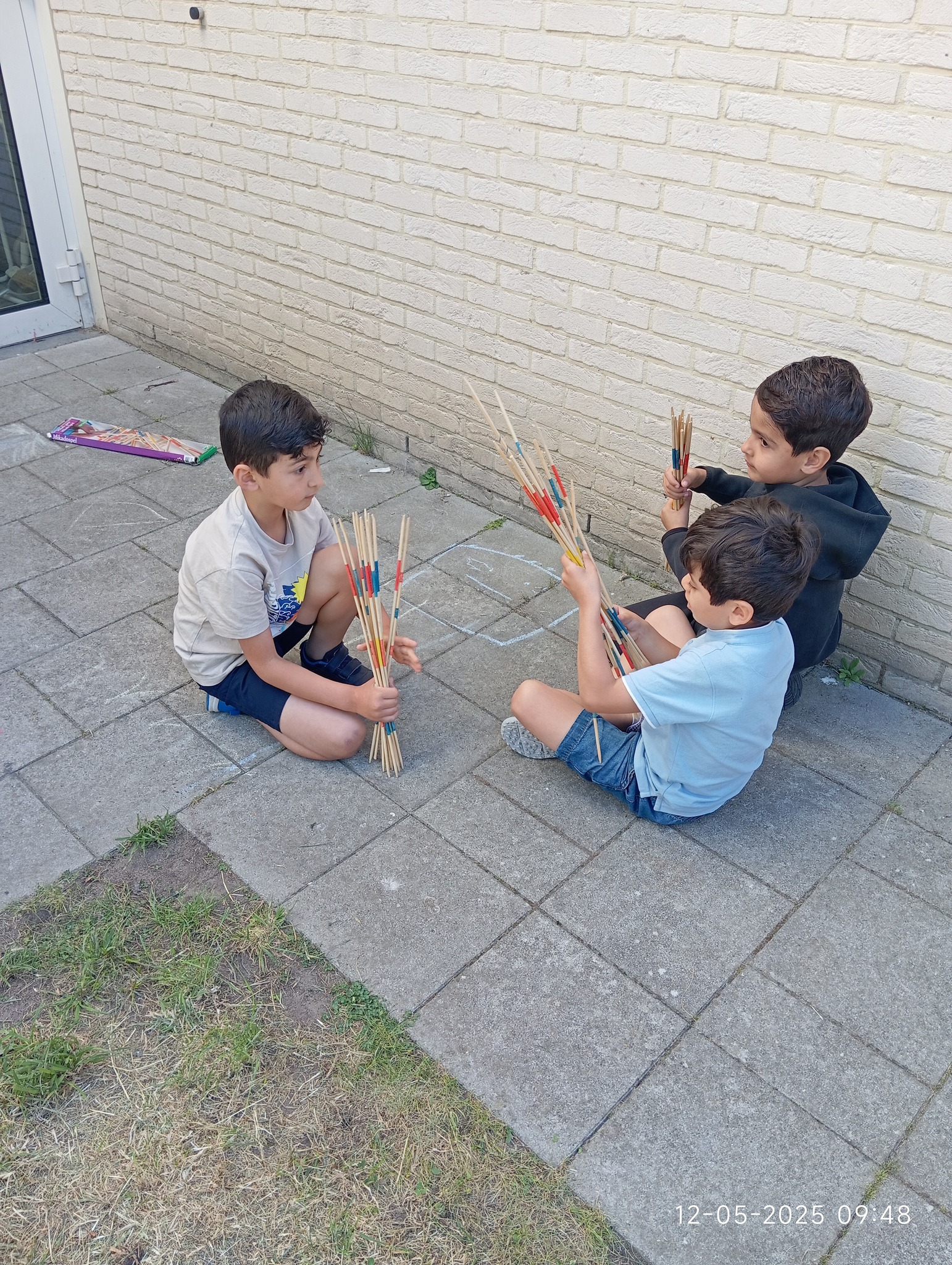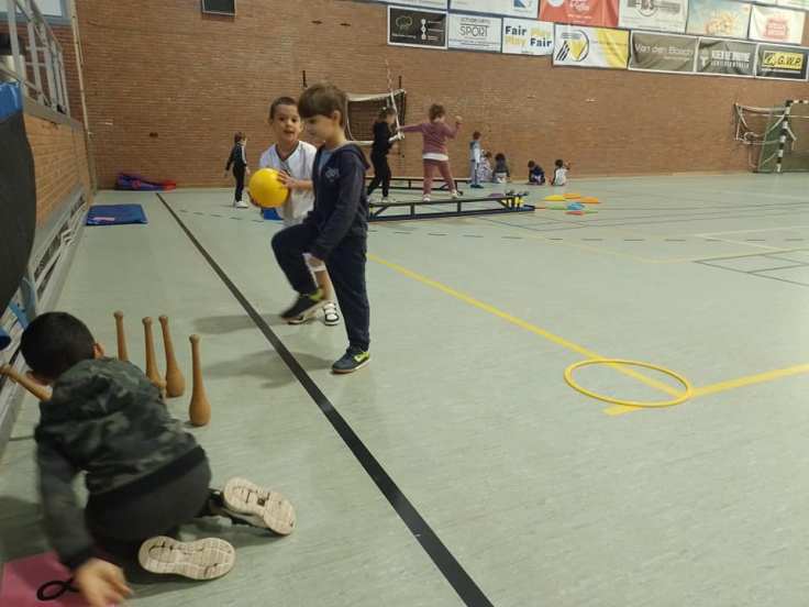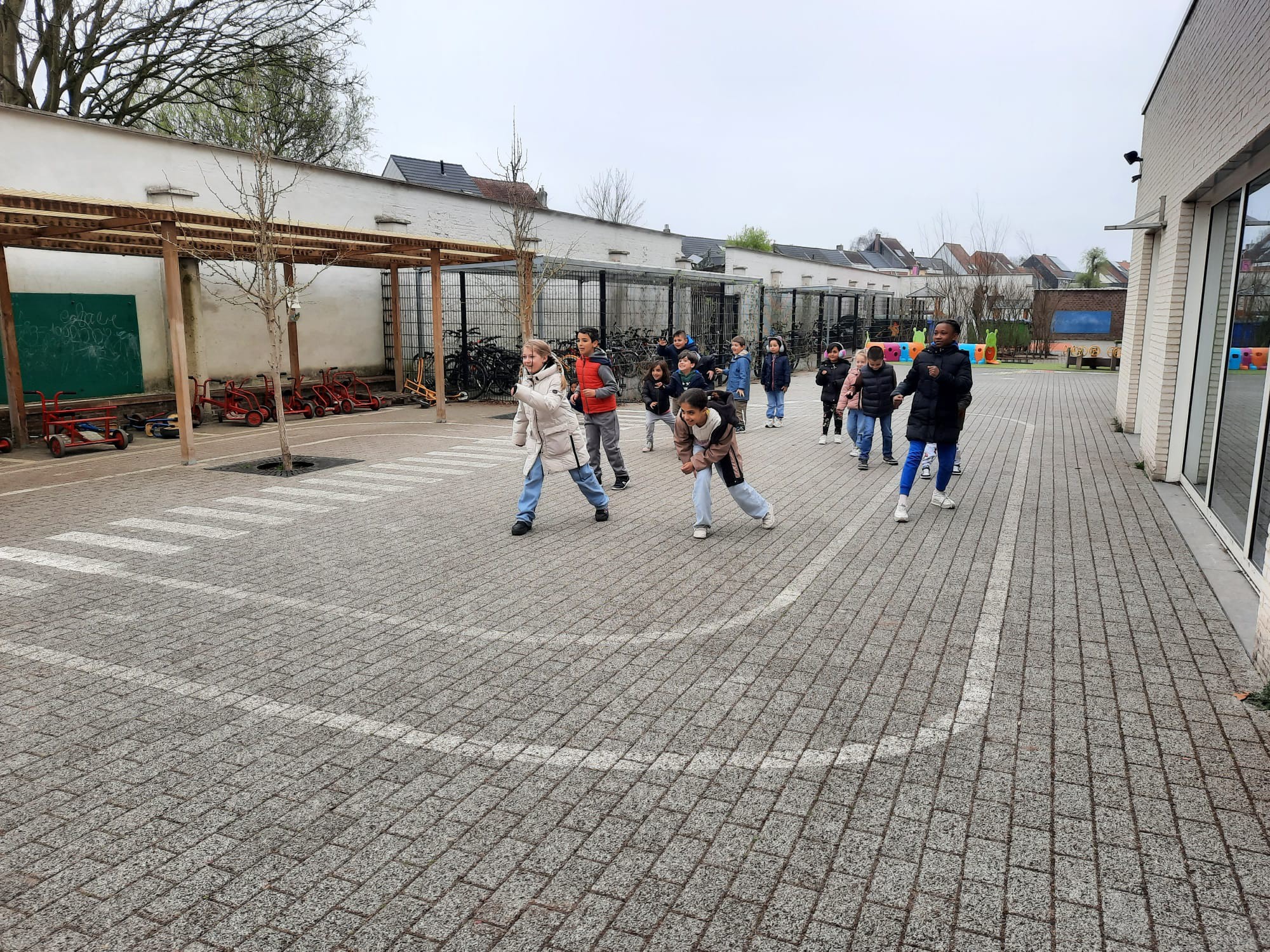 Het 3de leerjaar legde spelletjes uit aan de 3de kleuterklas en speelden deze samen: 123 piano, schaar-steen-papier en tik tak boem.