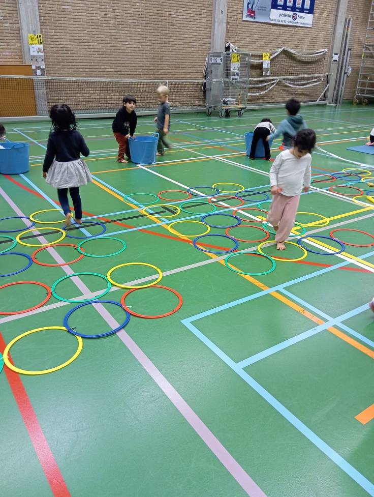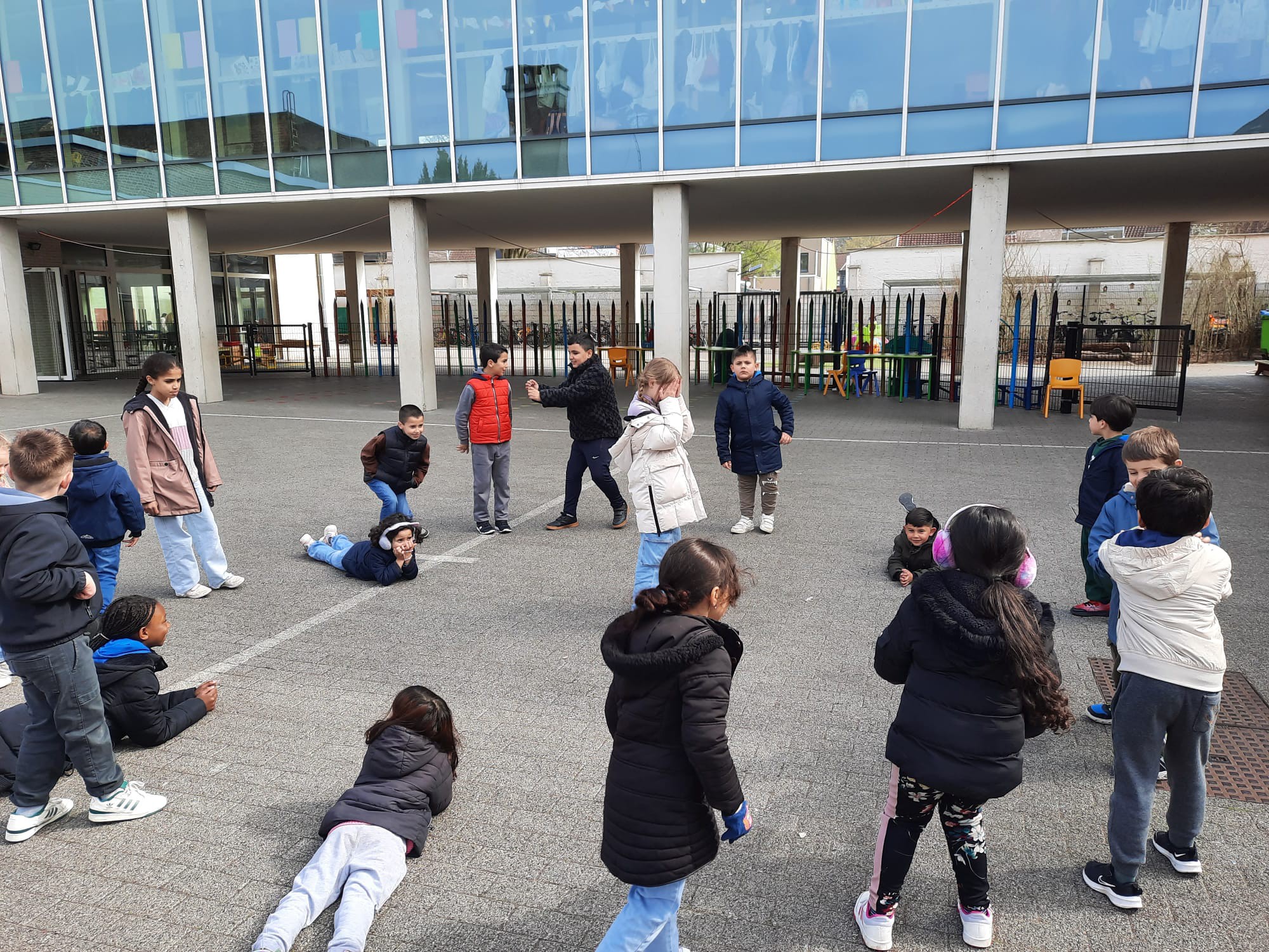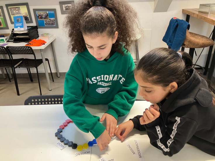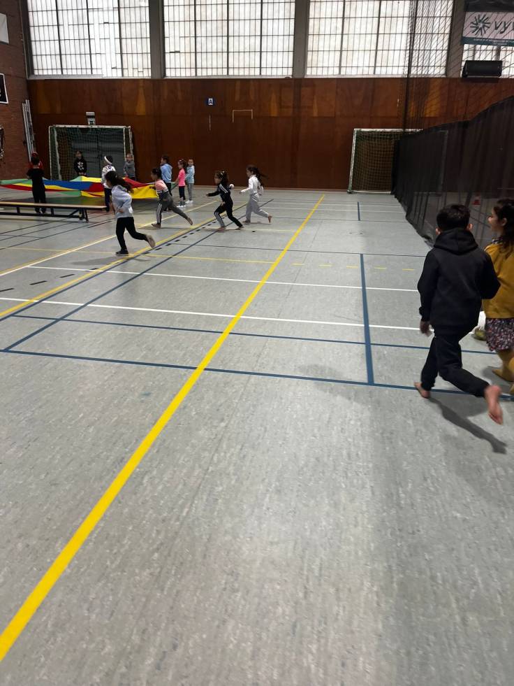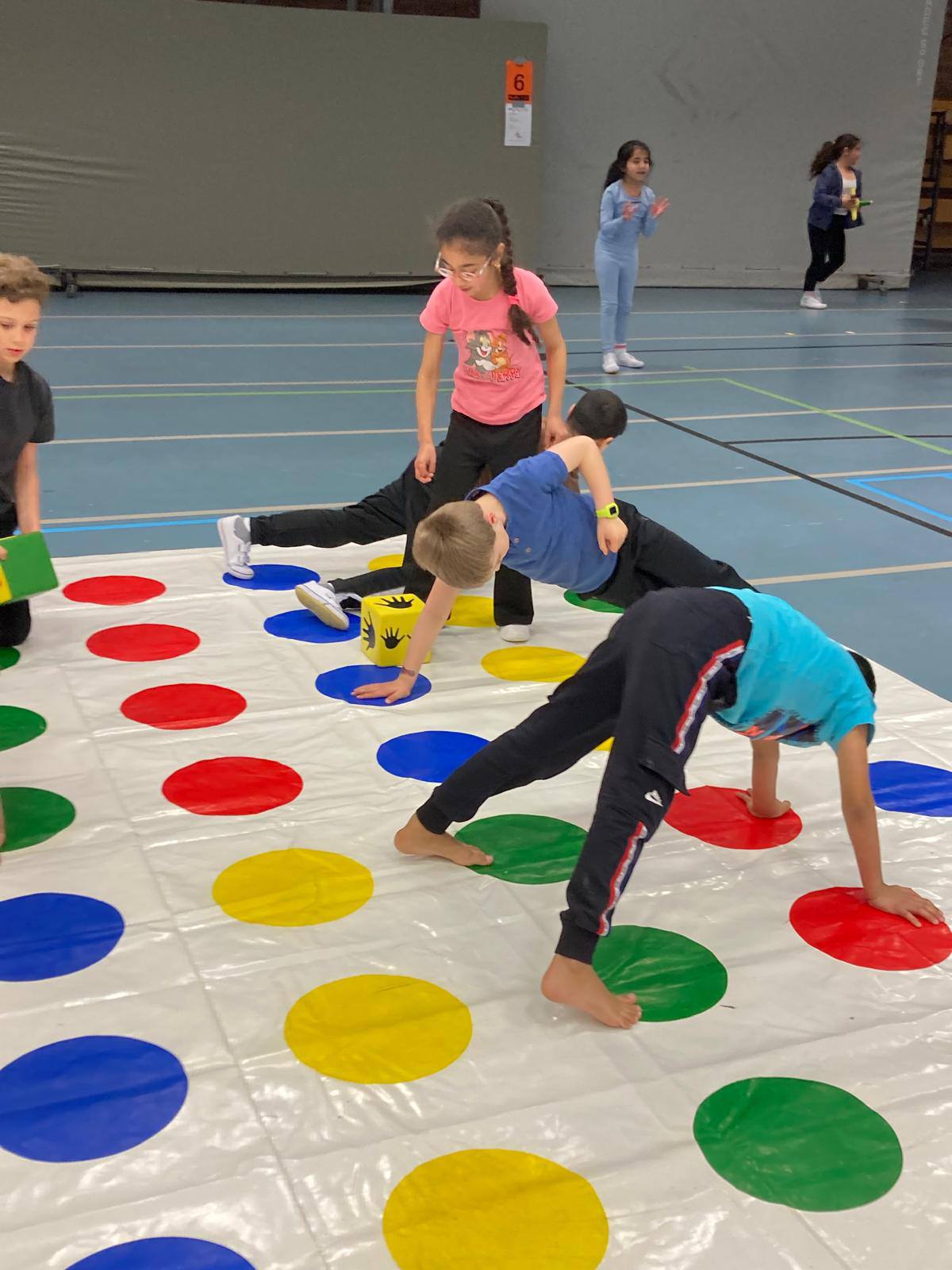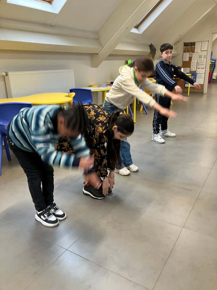 Het 3de leerjaar legde spelletjes uit aan de 3de kleuterklas en speelden deze samen: 123 piano, schaar-steen-papier en tik tak boem.