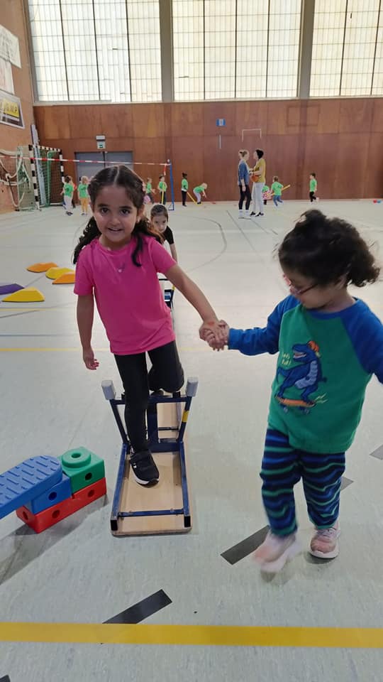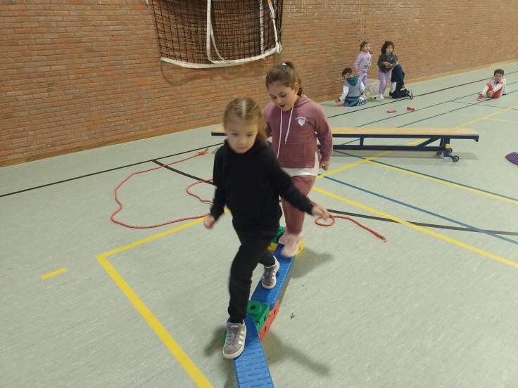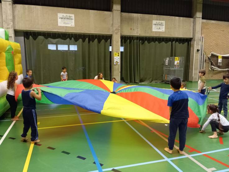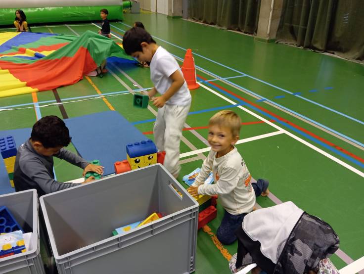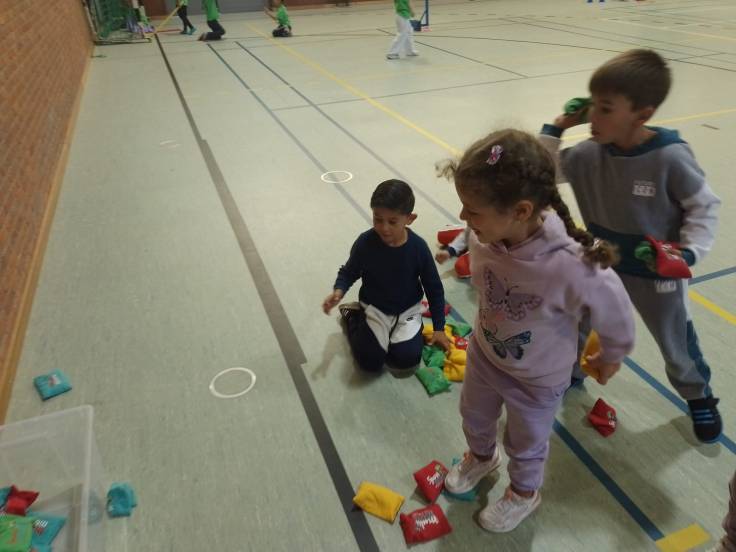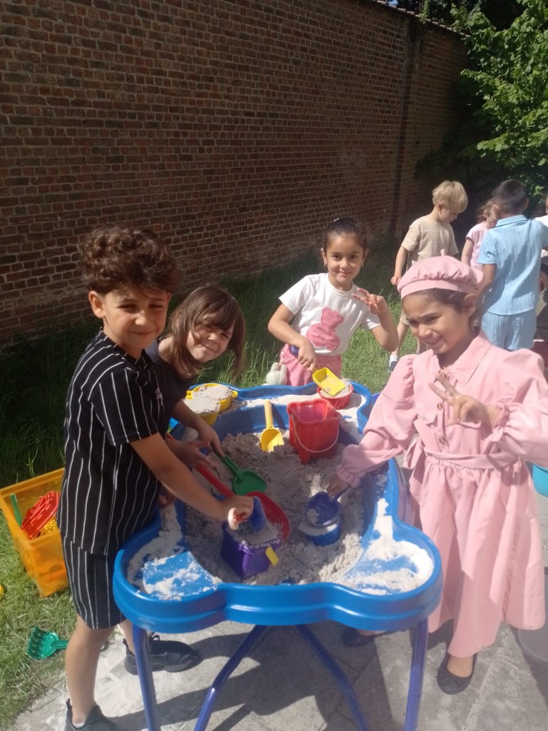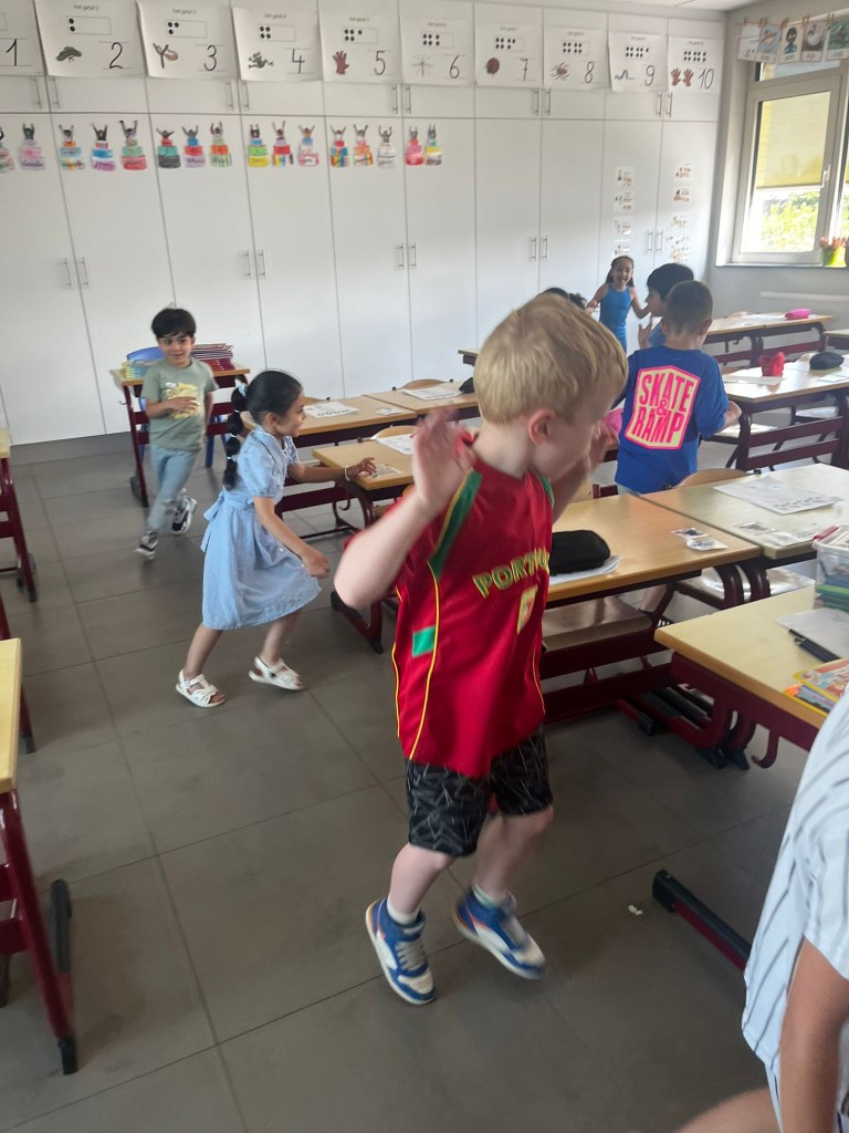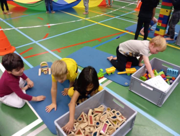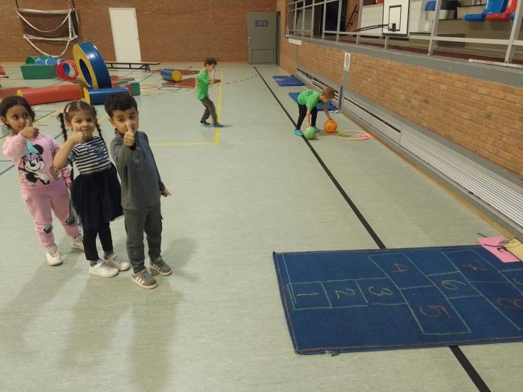 Het 3de leerjaar legde spelletjes uit aan de 3de kleuterklas en speelden deze samen: 123 piano, schaar-steen-papier en tik tak boem.