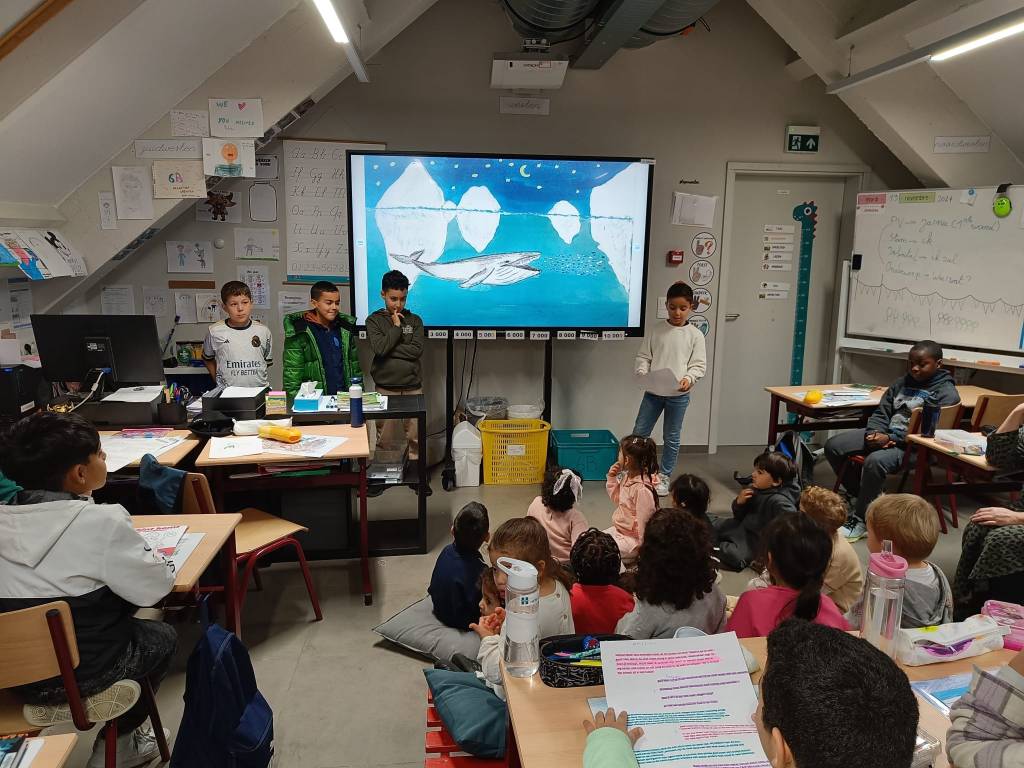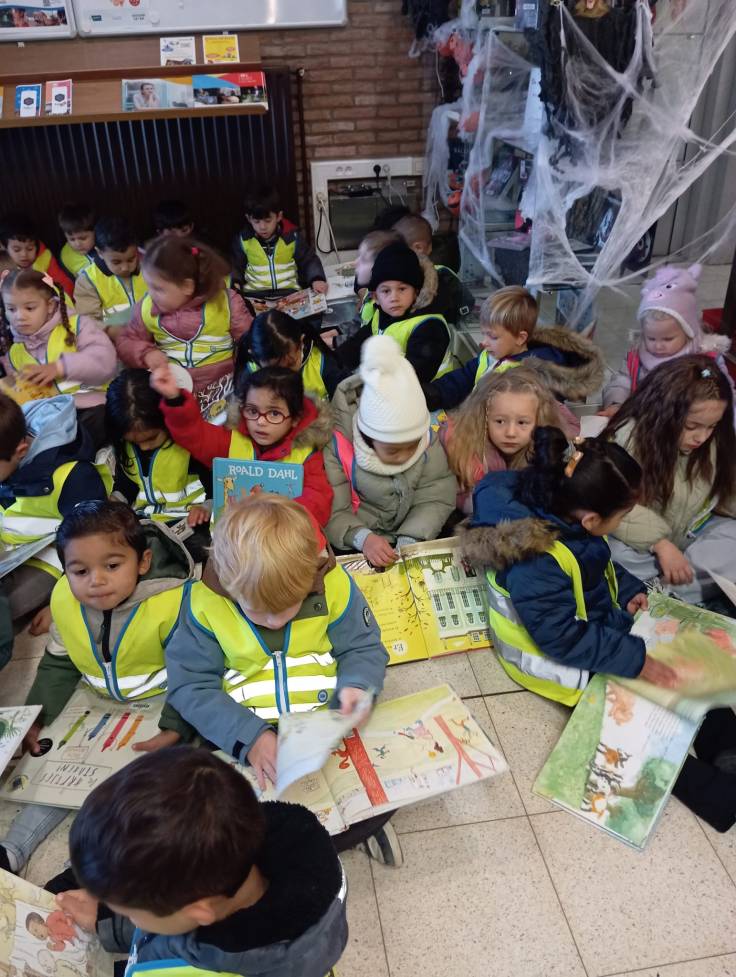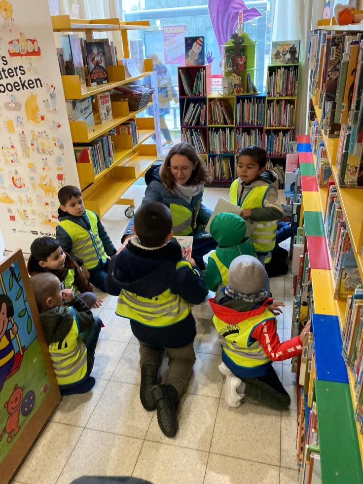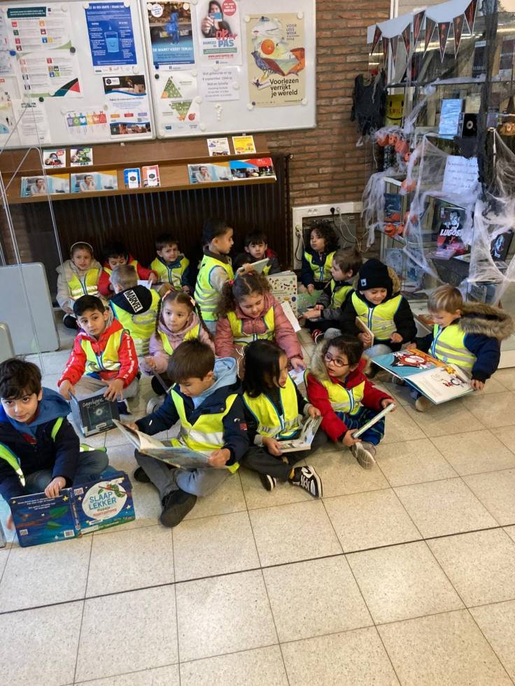 Onze 3de kleuterklas ging met het 4de leerjaar naar de bib gisteren.